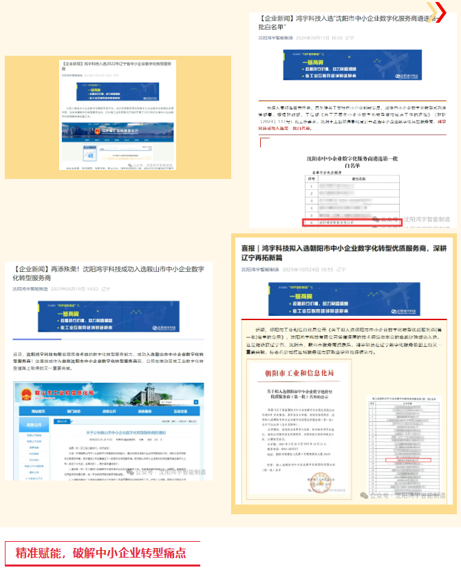 继斩获辽宁省、沈阳市、鞍山市、朝阳市中小企业数字化转型服务商资质后,沈阳鸿宇科技有限公司再传捷报!近日,辽阳市工业和信息化局正式公示遴选结果,公司凭借深厚的技术积淀、全域化的服务经验及定制化的解决方案,历经多轮严苛审核,成功入选辽阳市中小企业数字化转型服务商名单,标志着公司服务版图进一步扩大,区域数字化服务能力获得多地主管部门高度认可。