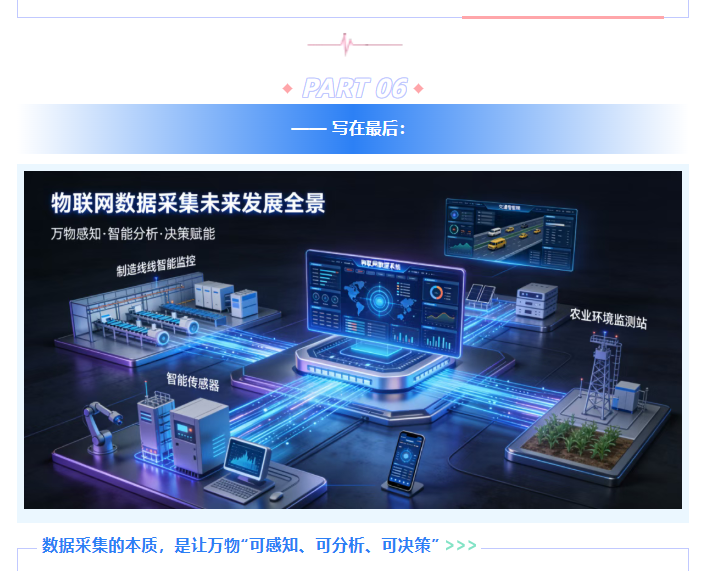 随着5G-A、无源物联网、AI自适应采集等技术的深度融合,物联网数据采集将朝着“更智能、更节能、更安全、更适配”的方向发展,未来,从工业制造的预测性维护,到城市治理的智能管控,再到民生服务的精准升级,都将依托更完善的数据采集技术,让“数据驱动”真正落地到每一个场景。