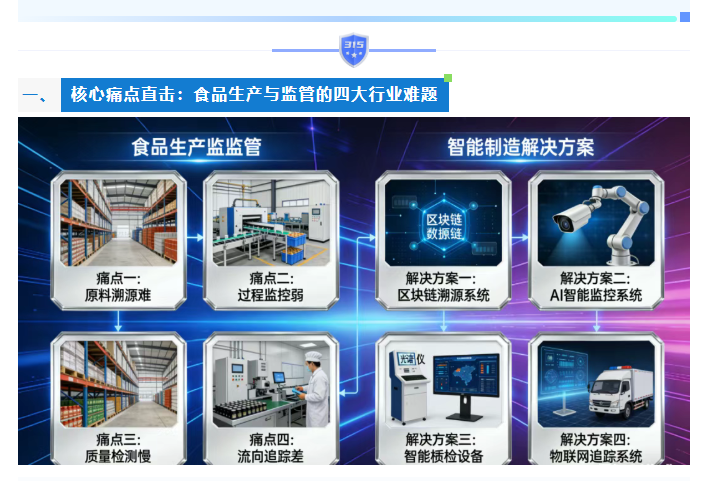 3全链路溯源困难从原料采购到成品流通,各环节数据割裂,问题食品出现后无法快速锁定源头,黑产业链难以被彻底斩断。