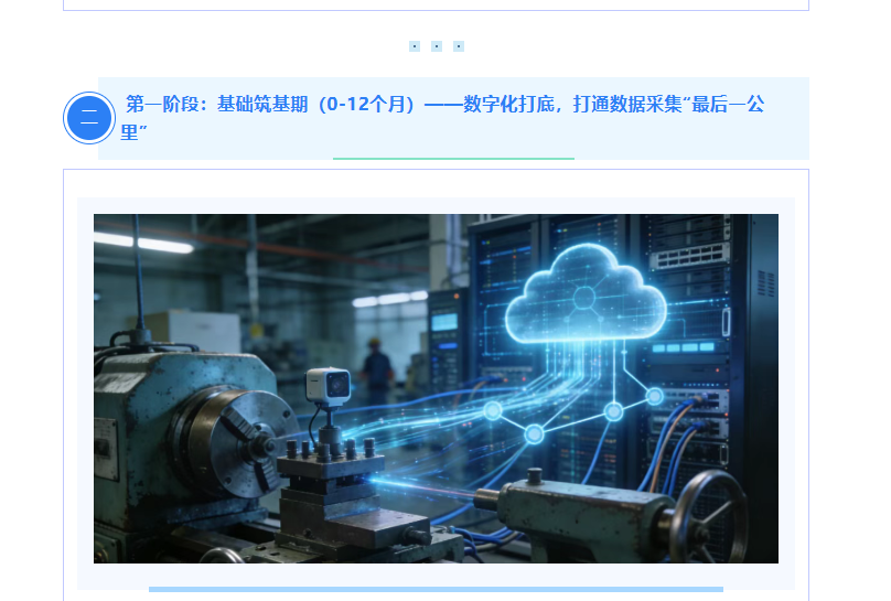 本阶段核心是补齐数字化短板,实现基础数据可感知、业务流程可线上化,针对老旧设备多、无数据采集、人工记账的企业,完成“哑设备”改造、基础系统部署、网络搭建,为后续升级筑牢底座,属于低投入、快见效的启动阶段。