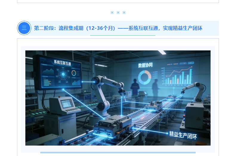 完成基础筑基后,企业进入系统集成、流程优化、数据协同的核心阶段,本阶段重点打通设备层、执行层、管理层的数据壁垒,解决“数据孤岛”问题,实现生产、供应链、质量、仓储的全流程协同,向精益制造转型,是数字化转型的核心攻坚期。