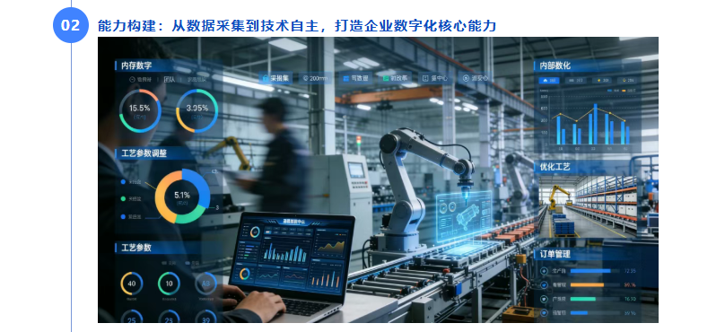 ·第一阶:效率提升级,核心是通过数字化技术解决生产效率问题,完成核心设备数据采集、核心业务线上化、生产状态可视化,实现人工统计工作量减少50%以上,设备非计划停机率降低15%,让企业直观看到数字化的降本增效价值,为后续升级积累经验。