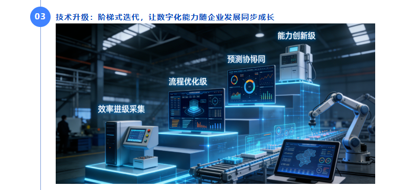 中小制造企业的数字化升级,不是“一次性改造”,而是“阶梯式迭代”,根据企业生产规模、业务需求、市场变化,分阶段升级技术体系,让数字化能力始终与企业发展相匹配,避免“技术超前闲置、能力滞后脱节”。