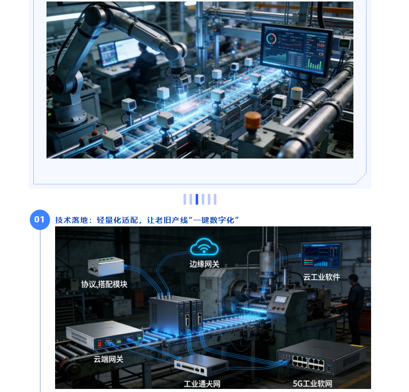 中小制造企业的数字化起点,从来不是更换全新设备,而是让现有产线、老旧设备实现低成本数字化改造,破解“设备无数据、流程无联动、管理无依据”的核心痛点,这一阶段的技术关键是“适配性改造、标准化采集、轻量化部署”。