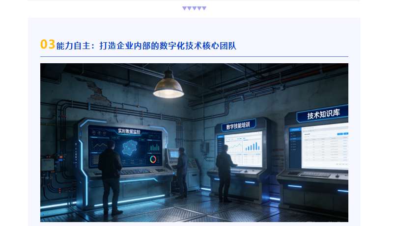 中小制造企业数字化转型的最大瓶颈,并非技术本身,而是技术能力的缺失——过度依赖外部服务商,系统上线后出现问题无法及时解决,数字化改造成果难以持续落地。实现技术能力自主,是让数字化转型从“外部输入”转向“内生增长”的关键,核心是打造一支懂生产、会数字操作、能简单运维的内部技术团队。