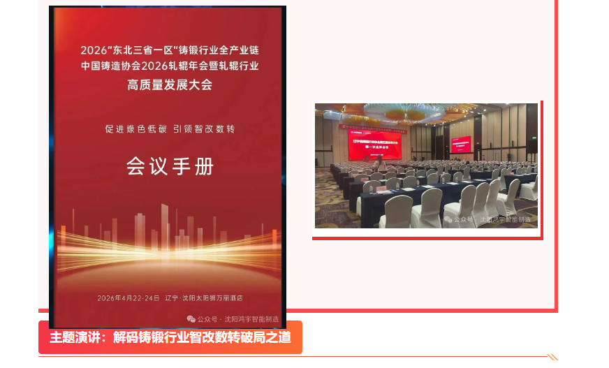 4月23—24日,2026东北“三省一区”铸锻行业全产业链大会暨中国铸造协会2026轧辊年会在沈阳圆满落幕。沈阳鸿宇科技以报告+参展商双重身份精彩亮相,圆满完成本次行业盛会的展示与交流任务。