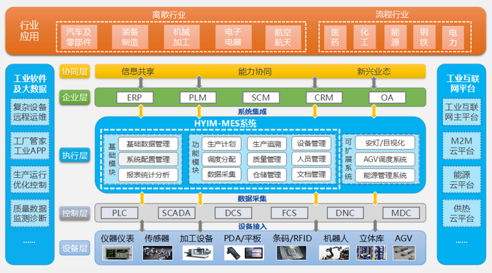 2)执行层:实现面向工厂/车间的生产管理,如维护记录、详细排产、可靠性保障等。制造执行系统(MES)在该层运行。