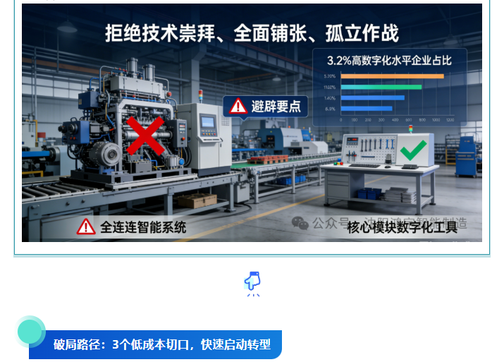 中国工业互联网研究院的调研数据显示,虽然多数中小企业已启动数字化转型,但达到较高数字化水平的仅占3.2%。这其中,“追求大而全、忽视自身需求”是主要诱因。