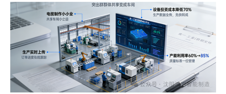 某高端智能制造产业园,针对当地电缆制造小微企业“智能设备采购成本高、MES系统不会用”的痛点,建设了配备智能化生产设备的共享车间,并搭建统一的工业互联网MES平台,为入驻小微企业提供生产代工、数据管理、质量管控等一体化服务。小微企业无需自行购置设备、部署系统,只需按需支付服务费用,就能借助共享资源实现生产数字化——生产数据实时上传、订单进度在线跟踪、质量标准统一管控。最终,20余家入驻企业的设备投资成本降低70%,产能利用率从60% 提升至 85%,产品合格率也大幅提高。