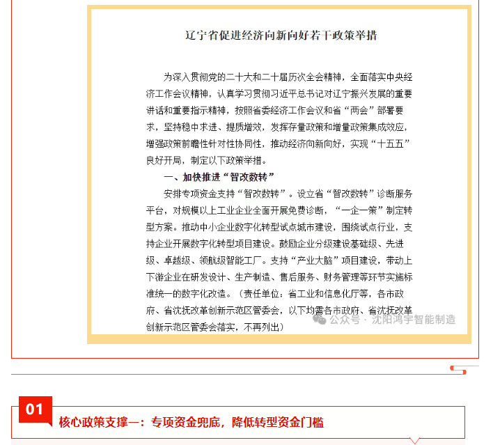 政策东风已至,转型时不我待。沈阳鸿宇科技有限公司将与全省企业携手,紧跟辽宁“智改数转”政策步伐,共同解锁数字化发展新动能,助推辽宁制造业高质量发展!