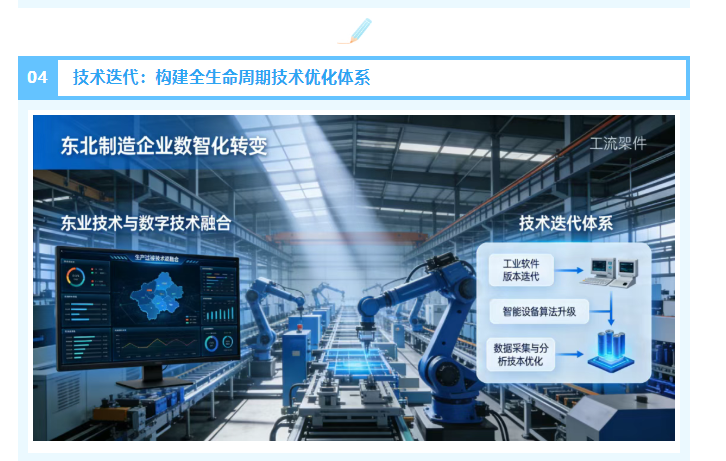 数智化转型并非一次性的技术升级,而是工业技术与数字技术的持续融合、迭代升级过程。东北制造企业作为技术密集型主体,对技术的稳定性、先进性、适配性有着极高要求,需要建立与企业发展相匹配的数智技术迭代体系。