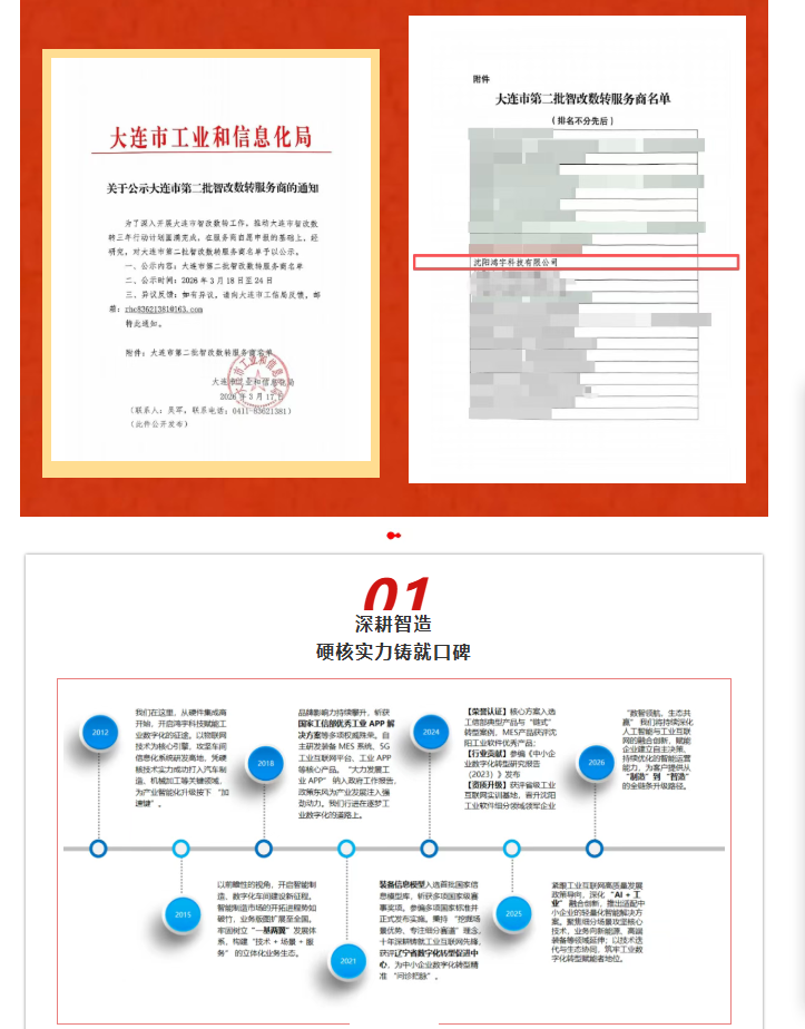 喜讯来袭!沈阳鸿宇科技有限公司再获行业权威认可,在斩获辽宁省、沈阳市、鞍山市、朝阳市、辽阳市中小企业数字化转型服务商资质后,成功入选大连市第二批智改数转服务商公示名单,这份由大连市工业和信息化局发布的公示结果,是对鸿宇科技技术实力与服务能力的又一高度肯定!