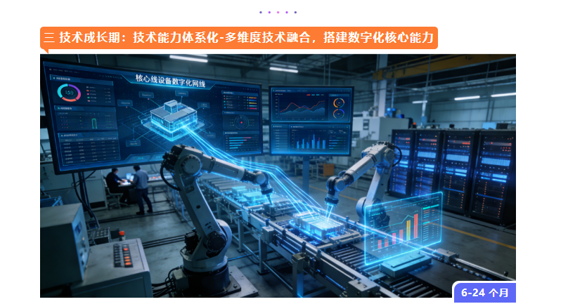 完成单点技术试错后,进入技术融合与能力体系化搭建阶段,核心是将单点改造的技术成果延伸至全产线、全流程,打通数据传输与流转链路,搭建企业数字化的核心技术能力,实现从“单点优化”到“局部提效”的跨越。