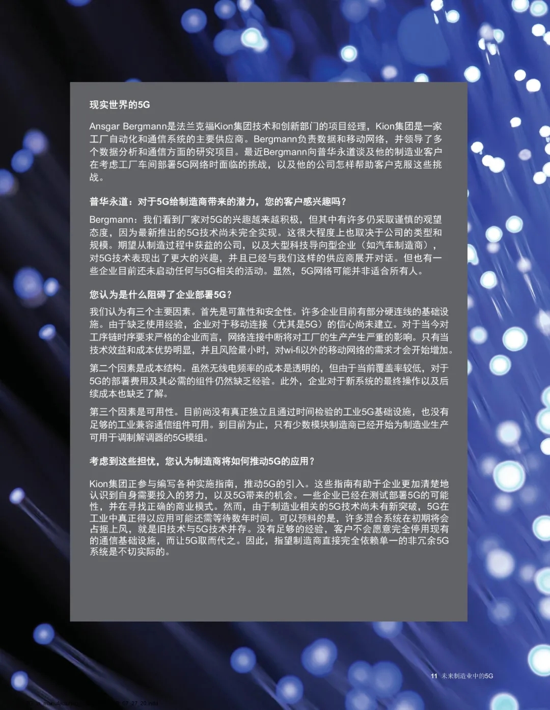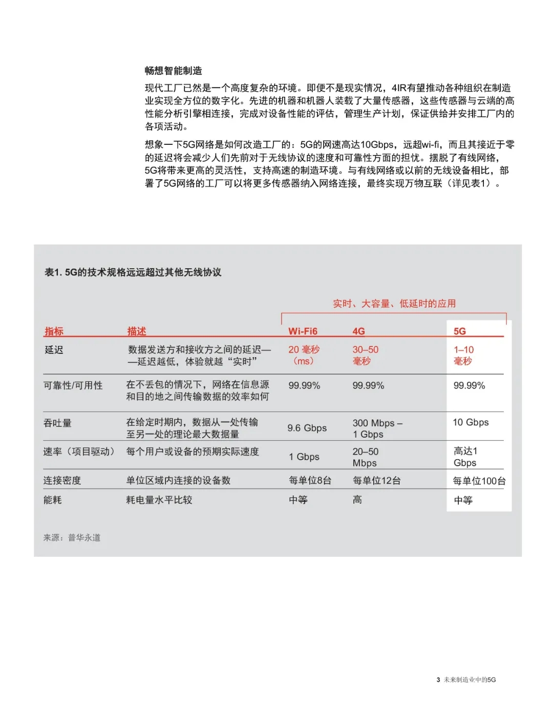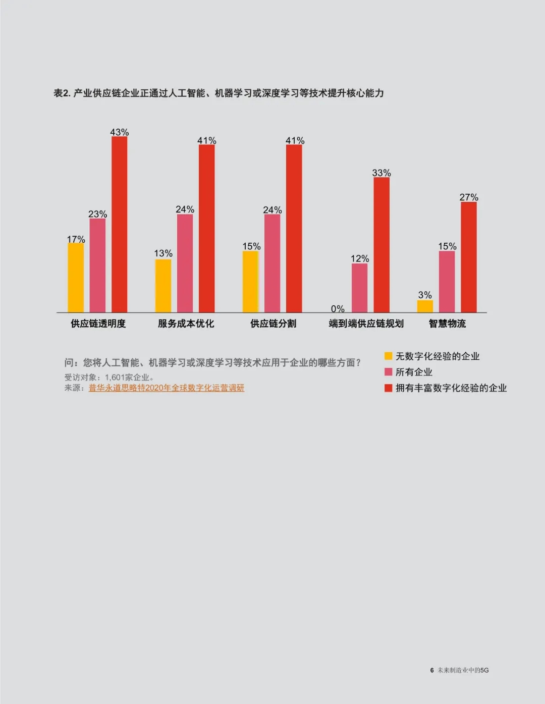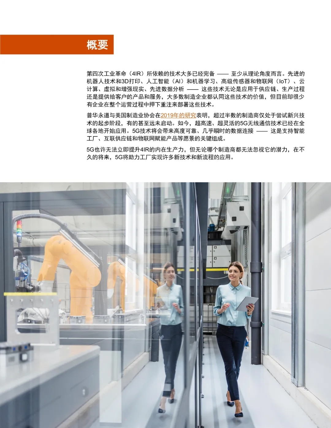 普华永道与美国制造业协会在2019年的研究表明,超过半数的制造商仅处于尝试新兴技术的起步阶段,有的甚至远未启动。如今,超高速、超灵活的5G无线通信技术已经在全球各地开始应用。5G技术将会带来高度可靠、几乎瞬时的数据连接 —— 这是支持智能工厂、互联供应链和物联网赋能产品等愿景的关键组成。