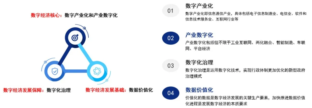 据中国信息通信研究院发布的《中国数字经济发展白皮书(2020年)》(以下简称信通院白皮书),从生产力和生产关系的角度来看,数字经济由数字产业化、产业数字化、数字化治理和数据价值化构成,其中数字产业化、产业数字化是数字经济核心产业。