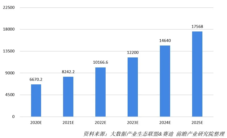 根据大数据产业生态联盟及赛迪发布的《2020中国大数据产业发展白皮书》,预计到2020年,中国大数据产业整体市场规模将达到6670.2亿元,到2022年将突破万亿元。在此基础上进一步预测,到2025年中国大数据产业整体市场规模将达到17568亿元左右。