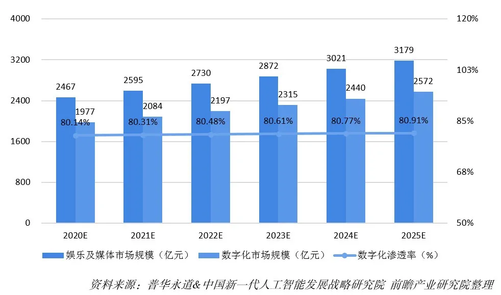 ▼图表:2020-2025年中国娱乐及媒体行业市场规模及数字化渗透率(单位:亿元,%)