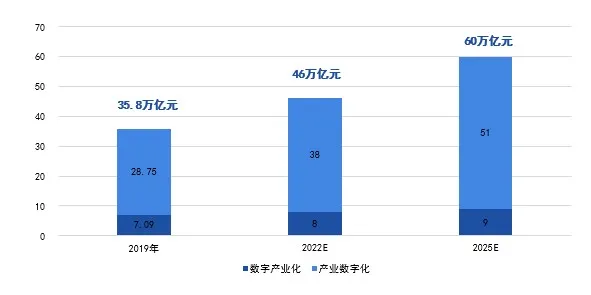 此外,根据历年数字经济的内部发展结构,预计2025年中国数字产业化规模将达到9万亿元左右,产业数字化规模将达到51万亿元左右。