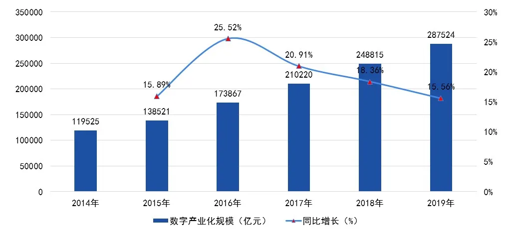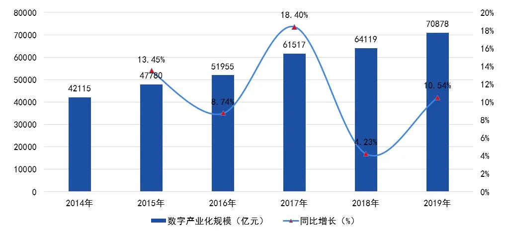 中国数字产业化稳步发展,市场规模逐年上升,2014年-2019年复合增长率为11%。2019年中国数字化产业增加值规模达到70878亿元,同比增长10.54%,占GDP比重为7.2%。