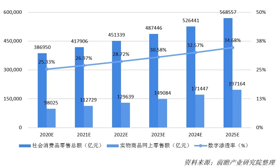 ▼图表:2020-2025年中国零售市场规模及数字化渗透率(单位:亿元,%)