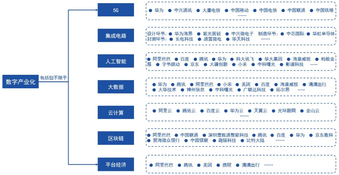 数字产业化即信息技术、及通信产业,是数字经济发展的基础产业,为数字经济的发展提供提供技术、产品、服务等方面的支持。数字产业化包括电子信息制造业、电信业、软件和信息技术服务业、互联网等行业,具体包括但不限于5G、集成电路、人工智能、大数据、云计算、区块链等。