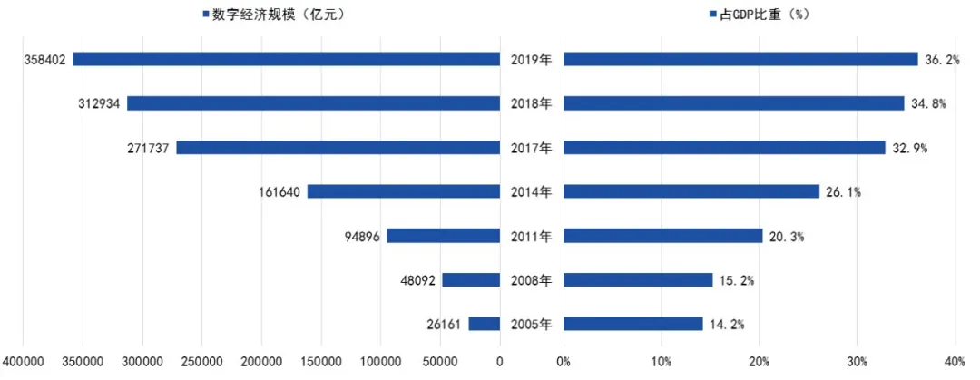 近年来,数字经济贡献水平显著提升。数字经济增加值规模由2005年的2.6万亿元增加至2019年的35.8万亿元,区间复合增速20.6%。与此同时,数字经济增加值占GDP的比重逐年提升,由2005年的14.2%提升至2019年的36.2%,占比较2018年提升1.4个百分点。