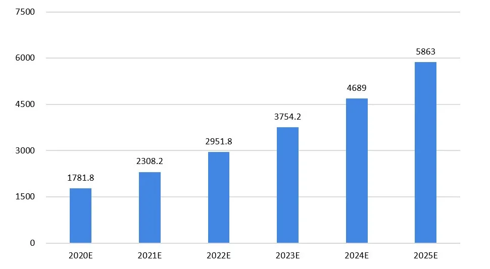 ▼图表:2020-2025年中国5G市场规模预测(单位:亿元)
