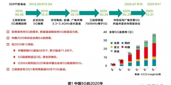 中国的5G实验室于2019年10月31日正式启动商用,但是真正的商用网络建设规模化是在2020年。在2020年,我们征服新冠肺炎疫情,疫情催热了对5G的需求,中国的新基建战略加快了5G的建设速度。在2020年,中国的5G建设就直接走进了独立组网的阶段,到年底,中国新增5G基站58万座,累计达到了71.8万个,5G的连接数超过了2亿,居全球首位。GSMA(全球移动通信系统协会)曾预测,在2020年年底,中国的5G占到全球5G连接数的85%,中国的5G在全球5G中明显占据举足轻重的位置。