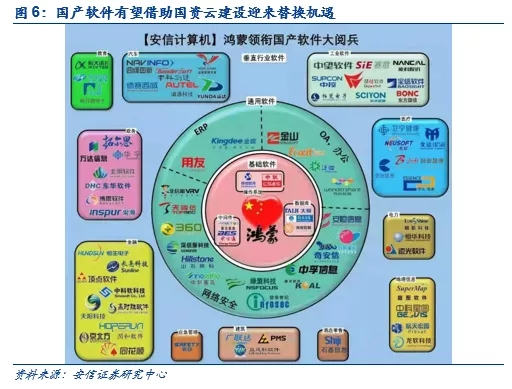 4、上层应用软件厂商国产替代的趋势进一步加强。底层的信创化要求上层的应用软件完成适配。目前,大部分的应用软件厂商已经完成了国产化的适配。随着工作负载的快速转移,应用软件顺势国产化也有望加速。以国产ERP企业用友网络为例,其2019年底即与天津国资云的大股东津投资本战略合作,2021年与国资云进行合作对接,目前已在国资云部署税务云、电子发票、统一入口系统、银企联云。