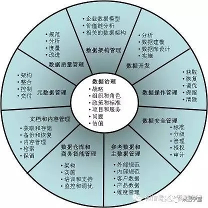 这里引用《DAMA 数据管理知识体系指南》一书给出的定义:数据治理是对数据资产管理行使权力和控制的活动集合(规划、监控和执行)。数据治理职能指导其他数据管理职能如何执行。可能有些抽象,有图有真相,下面这张图说明了数据治理与其他几个数据管理职能的关系: