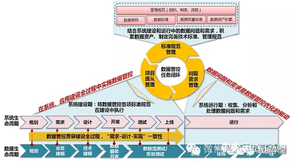 这张图的内容比较丰富,其核心内容是将“内容管控”中形成的各项标准规范注入到通过信息系统建设的生命周期中,通过对系统建设各个阶段交付物的管控确保标准规范得到遵从,从而保障数据的标准化和规范化。