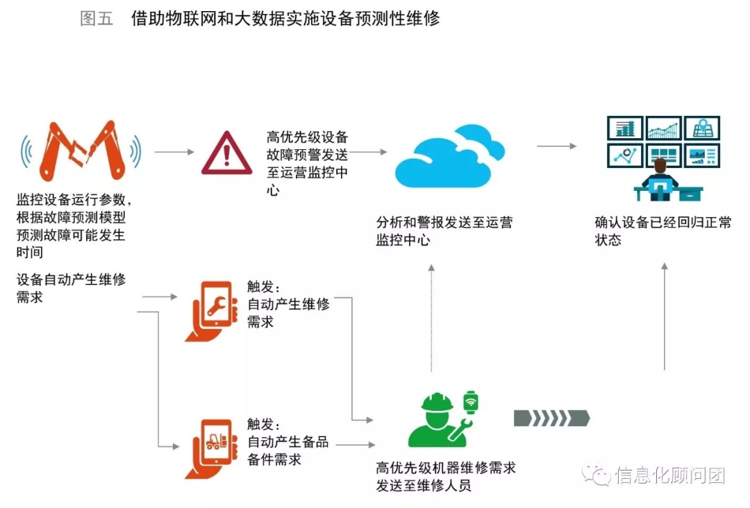力拓集团(RIO TINTO)是全球最大的资源开采和矿产品供应商之一,是世界第二大铁矿石生产商。如何降低价值昂贵的矿山开采设备故障率,增加设备在线时间,是提高矿石开采产量和开采效率的关键。力拓集团携手埃森哲,通过对设备历史故障几率、维修成本、业务影响程度进行分析,并结合设备属性,对设备进行分类排序;根据设备历史故障大数据分析,建立设备预知性模型,包括性能退化模型、可靠性模型、早期预警模型等,通过接收设备传感器数据,实时监控设备运行状态变化,利用预知性模型分析数据,对运行状态进行分类,进行设备健康性实时分析,对设备故障出现概率进行分析,提前预知设备故障出现的时间和影响,安排检维修计划,减少设备故障率,增加设备的在线时间,避免计划外的设备故障停机检修造成的损失。设备预知性平台上线后,设备非计划停工时间最大减少至75%,设备生产效率提升5%到25%,设备总体成本降低至15%至30%,项目投资回报率超过10倍(见图五)。