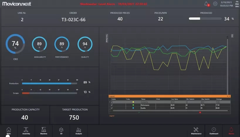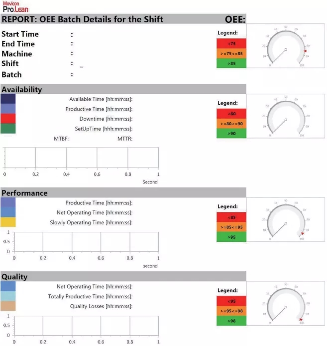 这些用户一直依赖软件的配置向导功能 (Wizards),使他们能够在几分钟内创建项目来计算关键绩效指标(KPI)、OEE 和停机事件。向导功能是提供一步步配置项目的工具,指导用户导入创建整个 OEE 应用所需的特定信息和参数。操作员使用仪表盘来可视化生产、配方、机器信息、生产的单位数量、总运行时间和停机事件,以及估计的与实际生产周期时间。这些信息被保存在一个数据库中,并可以创建详细的报告。其结果为专注于实现既定绩效目标的生产线操作员和管理人员带来了巨大的好处。