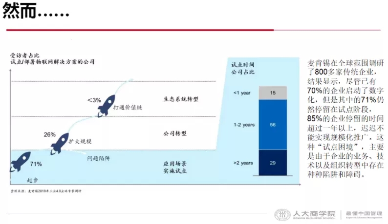 我们进一步看一下实际转型的现状。在麦肯锡的全球调研中发现,800家企业中,70%以上的企业启动数字化转型,但是其中的71%仍然停留在试点阶段,都在做0到1的探索。85%的企业试点停留的时间超过一年以上,迟迟不能实现规模化推广,没有真正产生价值,也说明了它的难度。