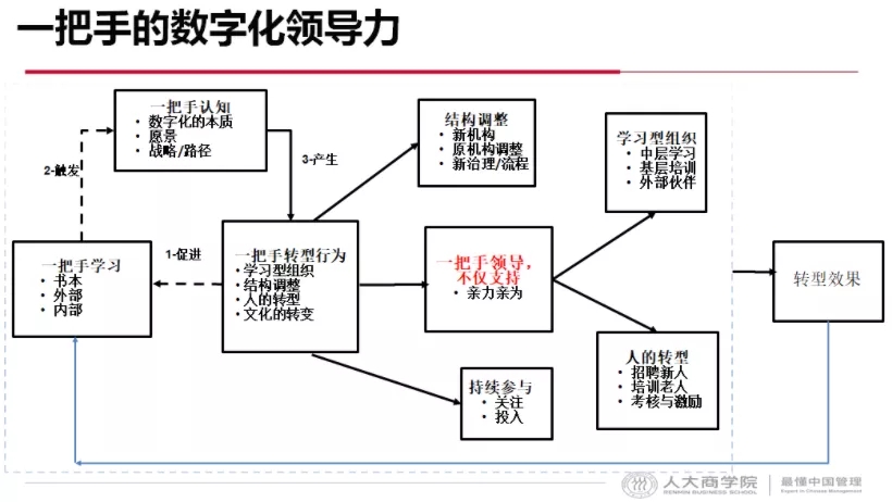 学习触发了认知的改变、愿景蓝图的改变、路径的制定。“一把手”核心转型行为就是打造学习型组织,重构组织,改变人。