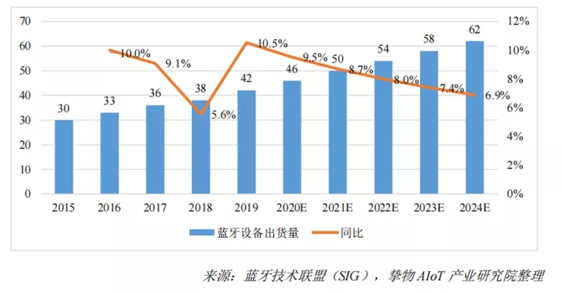 ▲ 2015-2024 年全球蓝牙设备出货量(单位:亿,%)
