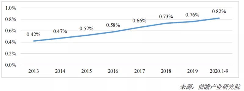 同时,中国芯片市场规模占 GDP 的比重持续上升。2019 年中国芯片市场规模占国家GDP 的比重为 0.76%,2020 年前三季度这一比例上升至 0.82%。芯片行业在国民经济中的重要性进一步增大。