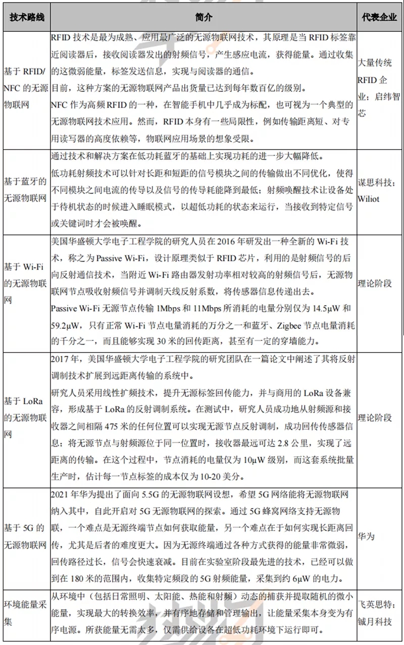 无源物联网的研究已有多年历史,目前市场上主流的技术路线包括 RFID/NFC、蓝牙无源物联网、Wi-Fi 无源物联网、LoRa 无源物联网、5G 无源物联网和环境能量采集等。