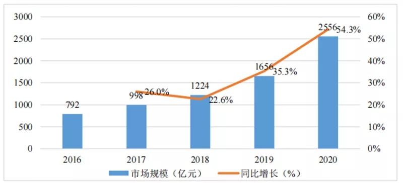 目前我国企业在智能网联汽车领域的布局已基本覆盖产业链各生产环节,不断推动着我国智能网联汽车产业由大变强。根据 iResearch 统计数据,2016-2020 年我国智能网联汽车产业规模呈现连续上涨趋势,2020 年产业规模增长到了 2556 亿元,同比增长 54.3%。
