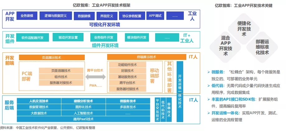 和传统工业软件一样,工业互联网APP的开发融合了工业知识和软件开发知识,需要工业人和IT人共同研发。和传统工业软件不同的是,工业APP的开发技术注重便捷化、混合化(跨平台)、部署运维标准化。