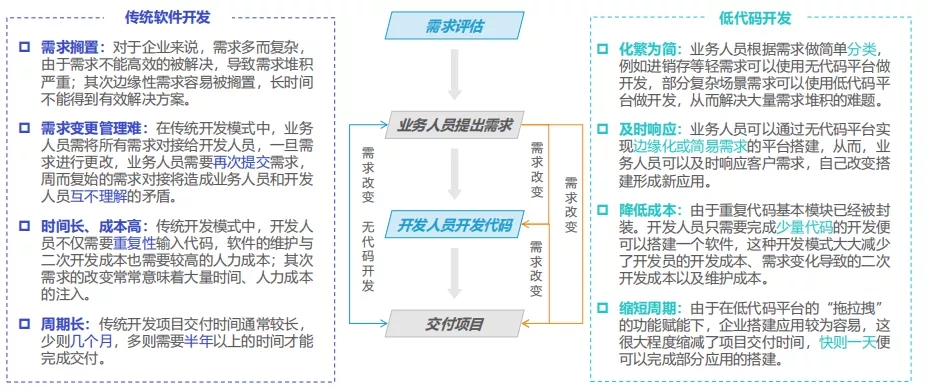 低代码平台一方面有效地解决了传统软件开发需求变动造成的业务和开发矛盾以交付时间冗长等难题;另一方面,低代码平台的开发性也实现了系统的互通互联,消除“云端孤岛”现象。目前,低代码平台可以减少传统软件开发50%的代码量;未来;低代码平台可以减少传统软件开发70%的代码量。