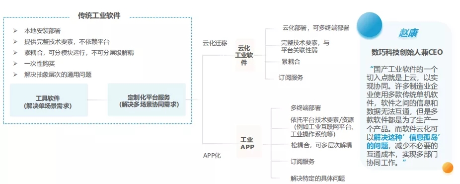 随着新兴技术的发展和企业对定制化和数字化的需求增多,工业软件也逐渐从原本的单一工具软件走向定制化的平台服务,目前正在朝着“上云”和“APP化”发展。