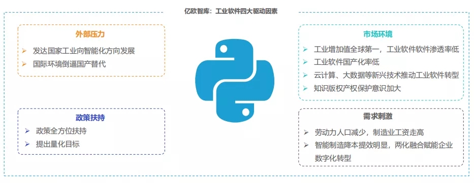 外部压力、市场环境、政策扶持和需求刺激四大因素将促进工业软件产业飞速发展。