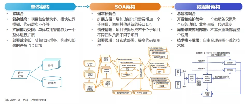 随着公司业务的逐渐复杂,软件架构从单体架构向SOA架构(Service Oriented Architecture)再向微服务架构(Microservice Architecture)演变。微服务架构旨在通过将各个应用程序和服务分散到各个单独的服务中,以实现解耦。