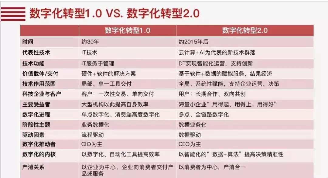 架构体系的迁移推动了企业数字化转型从1.0迈向2.0,如果说,数字化转型1.0是基于传统IT架构的信息化管理,那么数字化转型2.0就是基于云架构的智能化运营;数字化转型1.0是管理导向,数字化转型2.0是创新导向;数字化转型1.0的核心是业务数字化,数字化转型2.0是数据的业务化;数字化转型1.0是实现消费端数字化,数字化转型2.0是供给端数字化;数字化转型1.0是局部数字化,数字化转型2.0是全链路数字化;数字化转型1.0是流程驱动,数字化转型2.0是数据驱动;数字化转型1.0是基于硬件和软件的交付,数字化转型2.0是数据+算法提供了赋能;数字化转型1.0是产品经济,数字化转型2.0是结果经济。