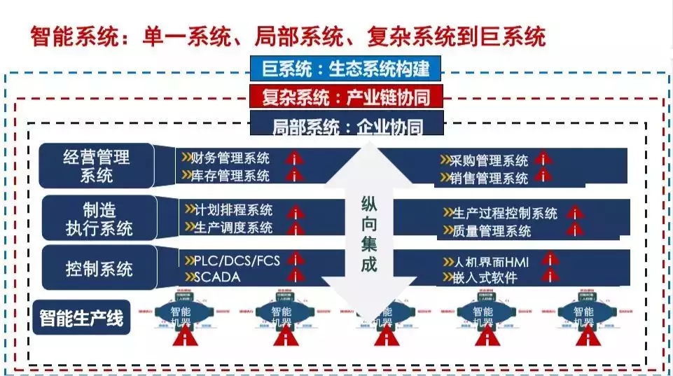 德国工业4.0讲横向集成、纵向集成、端到端集成,从这个角度来讲,什么是集成?集成是数据的互联互联网互操作,集成的本质就是对制造资源优化范围、领域深度的描述,从自动化到智能化,就是从局部优化到全局优化的过程,在时间上优化只有起点没有终点,空间上参与优化的资源从点、线、面、大系统、巨系统的方向不断地扩展。如果说,自动化是单点的、低水平的,有限的资源优化;那么,智能化是多点、高水平、全局的资源优化。所谓集成的过程,就是对制造过程的范围领域不断地深化的过程。