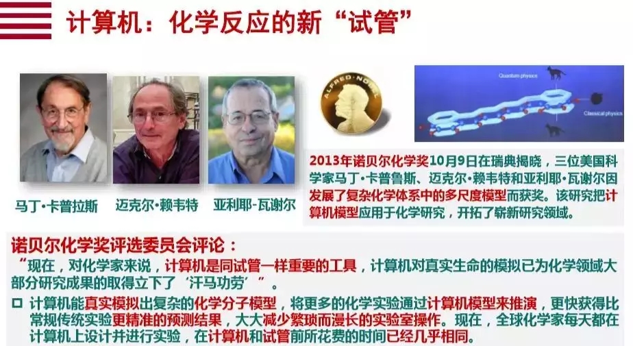 2013年的诺贝尔化学奖,因发展了复杂化学体系中的多尺度模型,颁给了三位美国科学家马丁·卡普鲁斯、迈克尔·赖韦特和亚利耶·瓦谢尔因。这三位科学家的贡献就是构建了一个做实验的方法论,做化学实验的方法论,这个方法论就是在计算机中做实验,它实际就是“数据+算法”的另一种的表现形式。