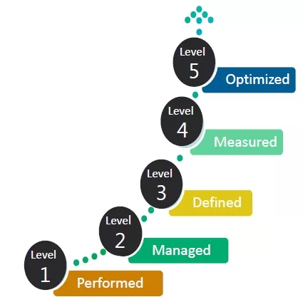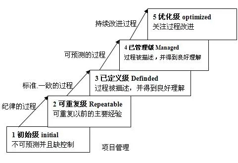 提到“成熟度评估模型”,不得不提一下能力成熟度模型的鼻祖——CMM。可以说,几乎所有成熟度模型都借鉴了CMM的思路,基本都是将所涉及的能力(例如:软件能力、数据治理能力、数字化能力)划分为多个领域,每个领域又可以划分多个子领域,每个子领域又可以分为多个评估指标。然后综合这些评标进行评估,从而得到该领域的成熟度情况。而所谓成熟度就是几个可以逐步提升的等级(CMM示例),如下图所示: