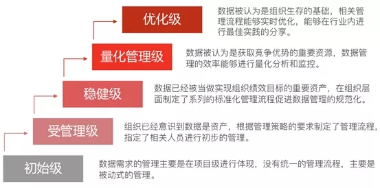 与CMMI类似,DCMM模型将组织的数据能力成熟度划分为初始级、受管理级、稳健级、量化管理级和优化级共5个发展等级,帮助组织进行数据管理能力成熟度的评价。