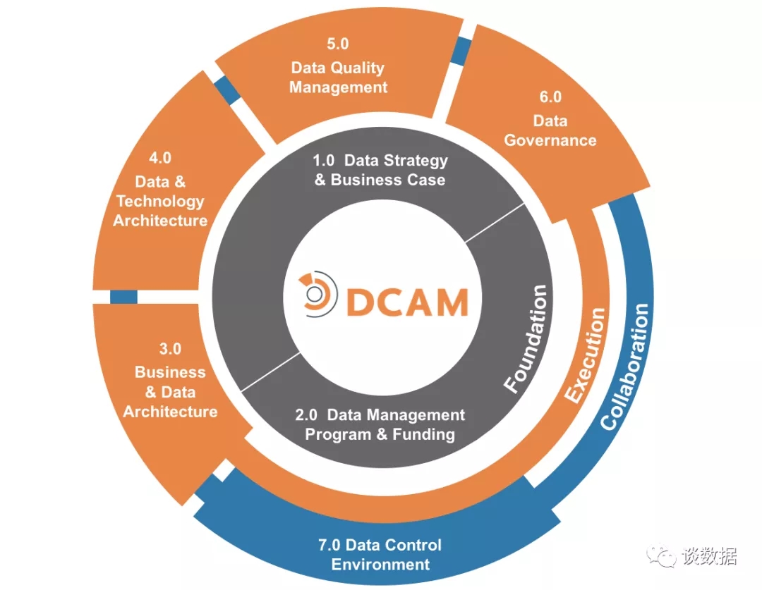 如上图所示,在DCAM2.0中,主要强调团队协作(流程)、标准执行和资金支持,DCAM2.0 分为以下职能域(7大组件):